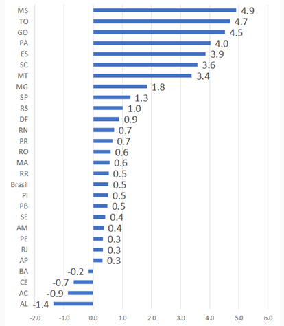 A partir desses dados é possível constatar que os estados de maior crescimento estão ligados ao agronegócio. Por isso, é fácil entender que o agronegócio é o único setor que conseguiu se manter e impulsionar o PIB brasileiro.