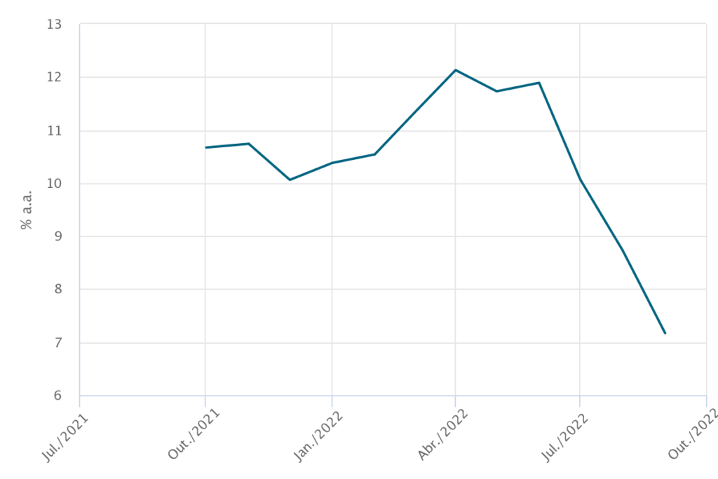 O gráfico abaixo mostra a trajetória da inflação nos últimos 12 meses, desde outubro de 2021.