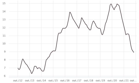 O mês de agosto de 2022 registrou 8,9%, patamar que não era registrado desde outubro de 2015.